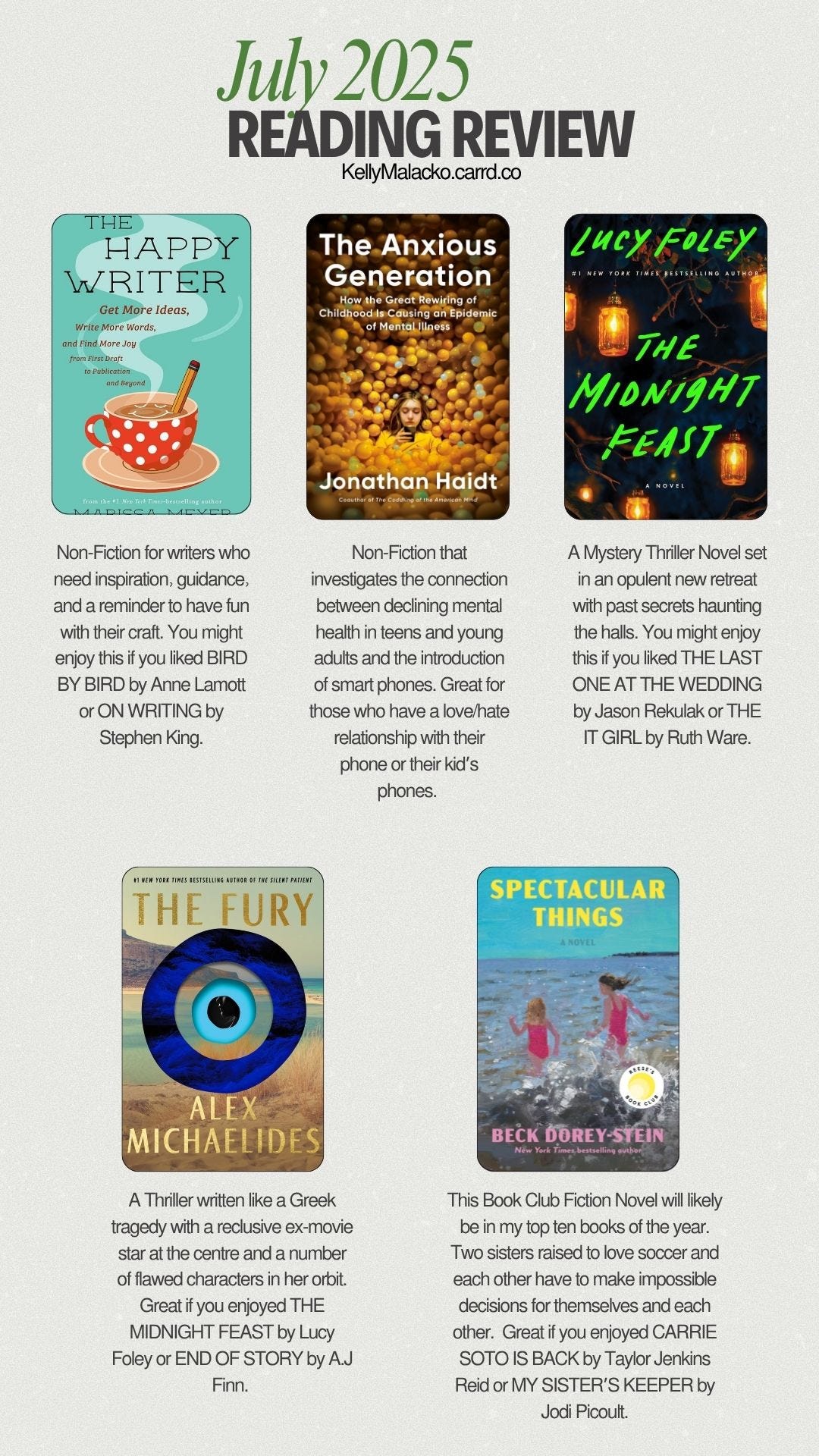 Surprise Standouts this month: SPECTACULAR THINGS was such a good book. I really enjoyed it. I find Reese’s Book Club very rarely goes wrong, and this was no exception. I will be looking into Beck Dorey-Stein’s backlist to see what else she’s written. Also, THE HAPPY WRITER was useful and motivating and quick to read.
